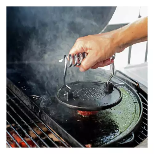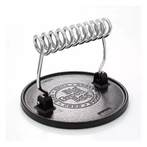 The NEW Big Green Egg Cast Iron Grill Press creates perfect “smash” burgers with crispy edges and a juicy center, and prevents curling when cooking bacon or ham.