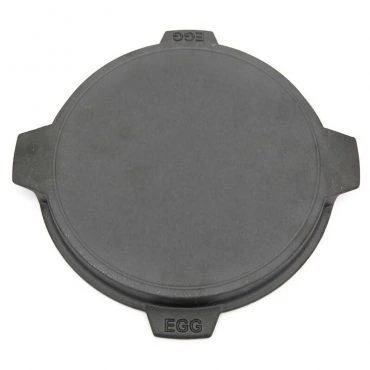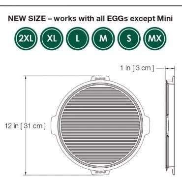 The Big Green Egg 10.5 in / 27 cm Dual-Sided Cast Iron Plancha Griddle is perfect for adding sear marks and a delicious flavor-packed crust to foods. This new size will fit perfectly in the MiniMax EGG on up! Big Green Egg cast iron products are built to deliver a lifetime of cooking enjoyment. You can use in your EGG for everything from blackened chicken and seafood, to grilled vegetables and steakhouse-style seared steaks. The ridged side is great for adding sear marks to food, or for roasting pork chops, hot dogs, chicken, asparagus and green beans.Use the smooth side to grill breakfast pancakes, omelets and hash browns. Drip channel to keep juices from falling on the charcoal.High quality castingPre-seasoned with food-safe vegetable oilThe four tabs are designed to be compact yet provide easy handling for either orientationExclusive Big Green Egg design – EGG molded under each tabDesigned to pair with the 10.5 in / 27 cm Cast Iron Skillet (Item: 120144, sold separately) to form a Dutch oven for the smaller EGG sizes.Size 10.5 in / 27 cm