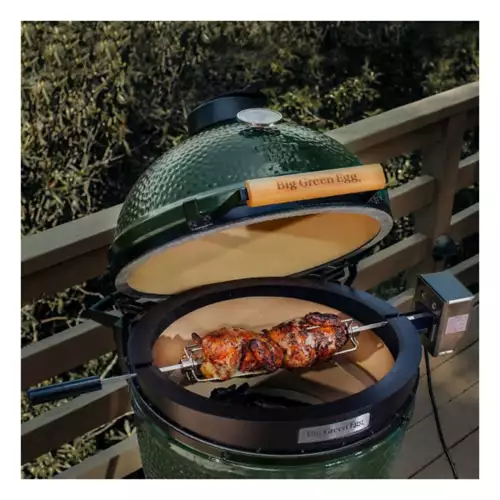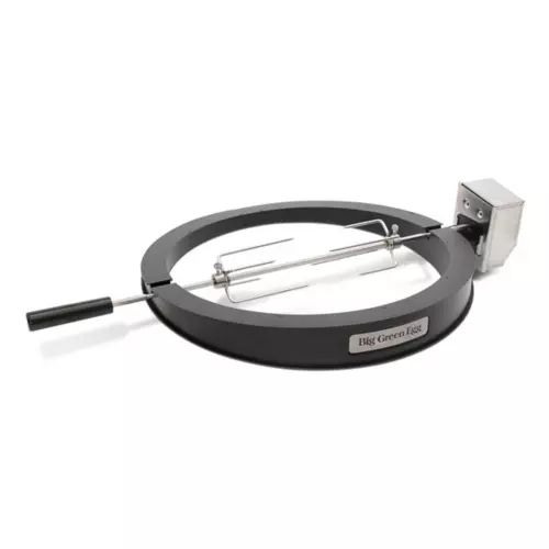 Convert your Big Green Egg into a wood-fired rotisserie! This complete rotisserie kit features a powerful, yet quiet 120V motor that will consistently and evenly turn food over the flame and a coated steel ring attachment that seals the EGG for optimal heat and flavor retention. The kit comes with the traditional rotisserie spit, but also works seamlessly with flat or tumbler style rotisserie baskets.